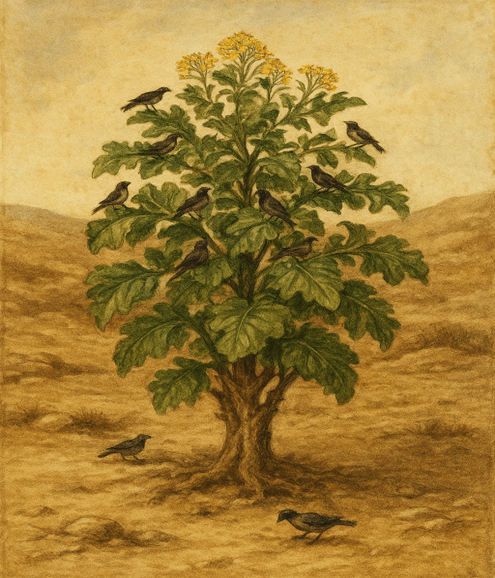 I added a little bit about the biblical mustard plant. The mustard plant in biblical times was much more than a humble herb—it was a vivid symbol of faith, transformation, and divine potential woven into the cultural and spiritual life of ancient Israel. Most scholars agree the biblical mustard plant was likely black mustard (Brassica nigra), known for its tiny seeds and rapid growth. It could grow up to 10–15 feet tall, with sturdy branches capable of supporting birds, aligning with Jesus’ parable in Mark 4:32. Mustard thrived in the arid, rocky soils of the region, making it a staple in subsistence Its seeds were used for culinary spice and medicinal remedies, treating ailments like digestive and respiratory issues. Farmers valued its resilience and versatility, as it required minimal care and grew quickly.